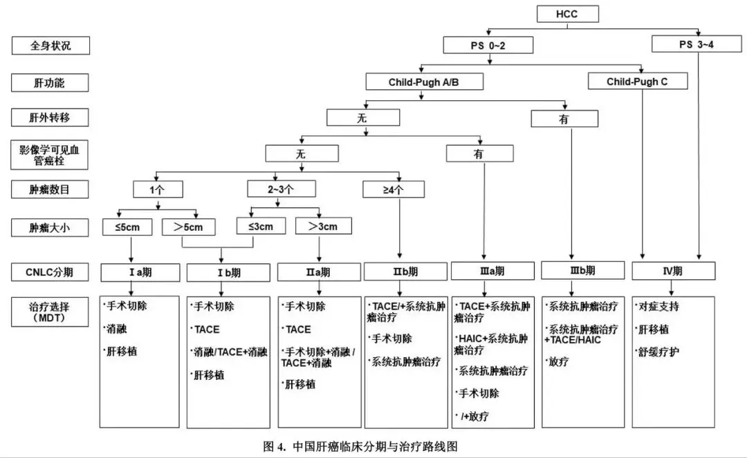 CNLC Ⅳ期:PS 3~4分,或肝功能Child-Pugh C级,不论肿瘤直径大小和数目,不论有无影像学可见血管癌栓,不论有无肝外转移 。