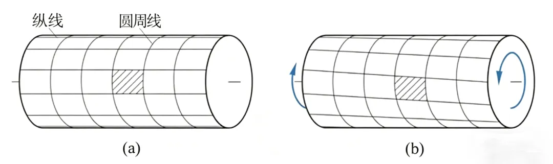 取一等截面圆轴,在其表面等间距地画上纵线与圆周线(图a),然后在轴端施加一对大小相等、方向相反的扭力偶(图b)。