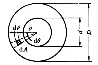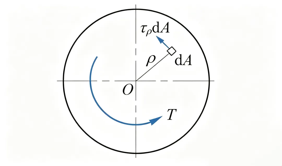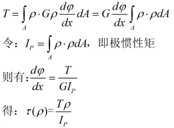 如图所示,在距圆心为ρ处的微面积dA上,作用有微剪力τρdA,它对圆心0的力矩为ρτρdA。在整个横截面上,所有微力矩之和等于该截面的扭矩,即: