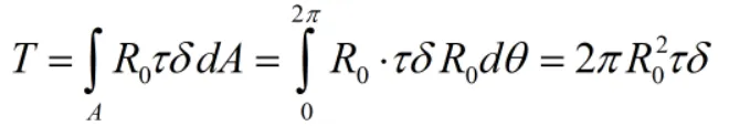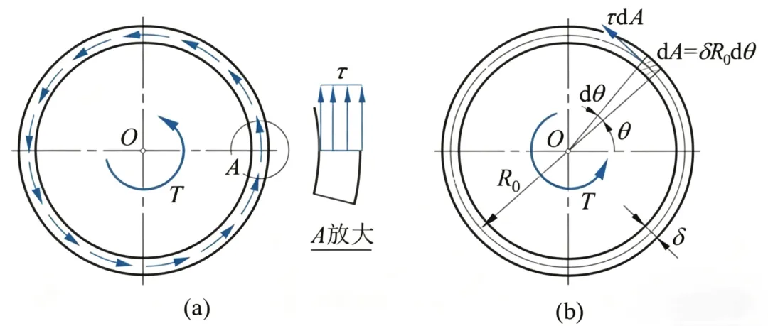 如图b所示,设圆管的平均半径为R0,壁厚为δ,则作用在微面积dA上的微剪力τdA,对轴线0的力矩为R0τdA,于是由静力学可知: