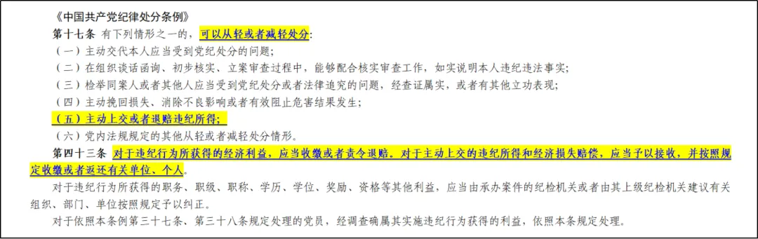 这是实践中主动上交财物的常见情形,根据《中国共产党纪律处分条例》(以下简称《条例》)第十七条规定,可以从轻或者减轻处分。