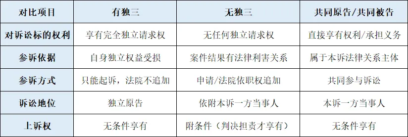 六、有独三vs无独三vs共同原被告核心对比