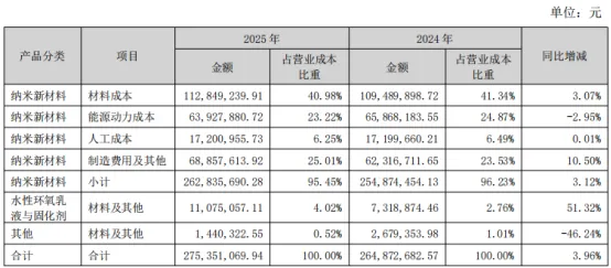 分产品看营收变化不大,营业成本变化不大,总体可以传导到下游,毛利率稳定。但是分地区看,境外和境内营收和成本均较上年增减较多,猜测境外营收下降可能是为了稳定毛利率导致的销量下降。纳米新材料销售均价相对稳定,较24年有所下降,销量较24年有所提升。公司2025年生产量和期末库存量同比增长分别为7.76%和53.77%,主要原因是客户订单增加以及募投项目投产,逐步释放产能,带动生产量和所需备货库存量增加。