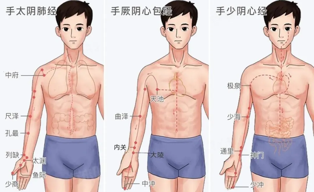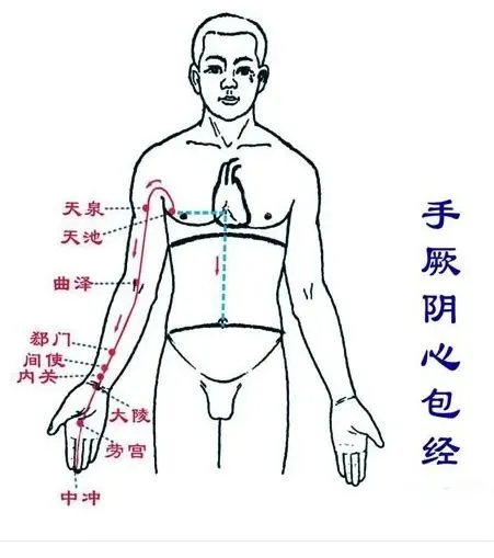 起于胸中 → 属心包 → 络三焦 → 腋下3寸(天池)→ 腋窝 → 上肢内侧中线 → 肘窝 → 前臂两筋间 → 掌中 → 中指端(中冲)