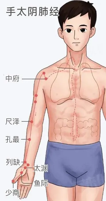 起于中焦 → 络大肠 → 属肺 → 横出腋下(中府)→ 沿上肢内侧前缘 → 肘窝 → 腕桡侧 → 大鱼际 → 拇指端(少商)