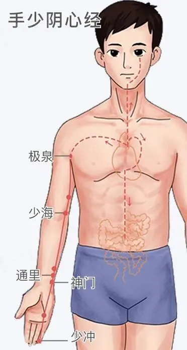 起于心中 → 属心系 → 络小肠 → 上肺 → 出腋下(极泉)→ 上肢内侧后缘 → 肘窝 → 腕尺侧 → 掌后豌豆骨 → 小指桡侧端(少冲)