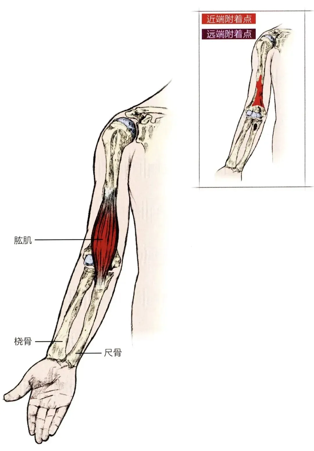 肱肌是上肢屈肘动作中的关键肌肉之一,位于肱二头肌深层,附着于肱骨干前方远端1/2处,向下止于尺骨粗隆。其起点在肱骨前方远端二分之一的骨面,止点位于尺骨粗隆,这一附着点使其成为直接作用于尺骨的屈肘肌。
