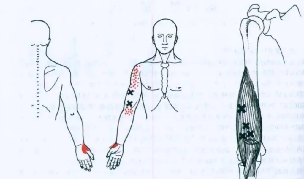 推举动作(如卧推):肱肌稳定肘关节,辅助力量传导至肩关节。 肱肌的扳机点常因过度使用或损伤而形成,局部压痛明显,并可向周围放射。疼痛可向上放射至肱骨远端,向下可延伸至大鱼际及第一掌骨区域。这种放射性疼痛模式与肌筋膜疼痛的传导规律相符,临床中需与颈椎源性疾病或神经卡压鉴别。