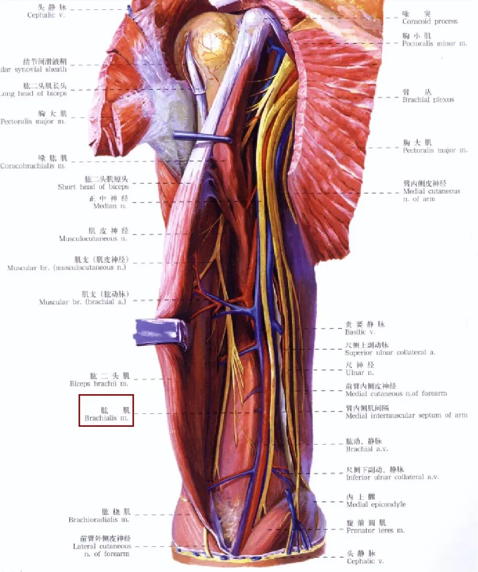 附着于关节囊的肌群可防止关节囊因肘关节屈曲及滑动到其自身的近端而受到挤压。肱肌与神经的关系密切,主要体现在两方面:神经对肌肉的支配,以及肌肉对神经的影响。肱肌的神经支配来自肌皮神经(C5-C6),该神经穿行于肱肌与肱二头肌之间,若肱肌紧张或损伤,可能卡压肌皮神经,导致肱肌本身出现压痛点、肌张力增高,甚至引发前臂外侧皮神经支配区的疼痛。此外,肌皮神经的近端通路还经过胸小肌、斜角肌间隙等潜在卡压点,因此肱肌的症状也可能是上游神经卡压的下游表现。(变异:约10%个体中,肱肌可能接受桡神经(C5-T1)的副支支配。 )