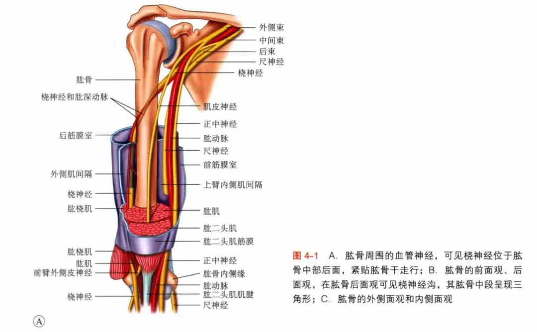 - 静脉回流:伴行静脉汇入肱静脉及腋静脉。 肱肌还与桡神经相邻。肱肌外侧与肱桡肌、肱二头肌共同构成桡管,桡神经深支(骨间后神经)由此通过。肱肌的过度使用或损伤可导致桡管内压力增高,压迫桡神经,从而出现虎口区麻木、伸腕无力等桡神经功能障碍的表现。