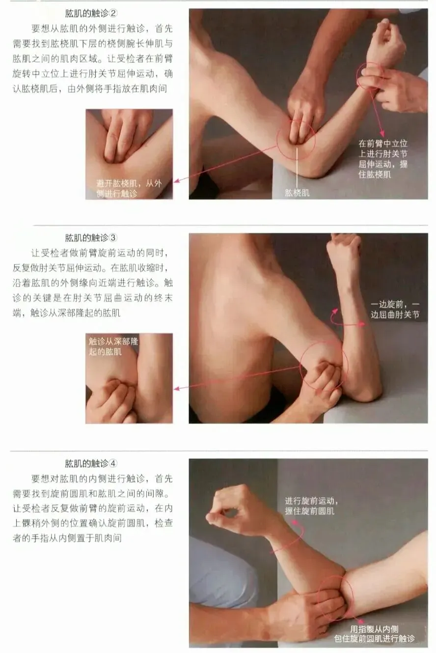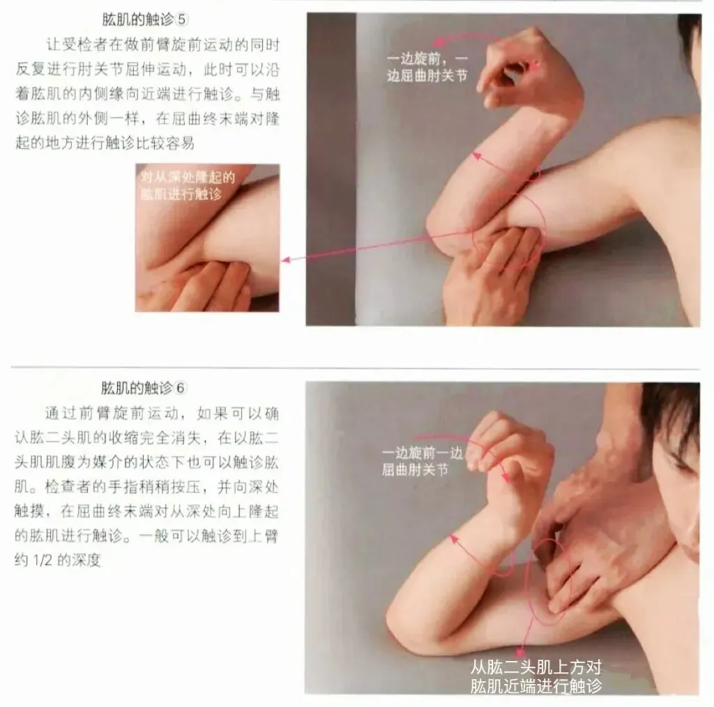 肱肌的触诊需在肱二头肌深层进行,由于肱肌完全位于肱二头肌深面,可从前臂抗阻屈肘时,从肱二头肌外侧或内侧缘向深部按压感受肌腹。也可在屈肘位被动按压肱二头肌深面以寻找压痛点。检查时,嘱患者抗阻屈肘,同时触诊肱二头肌深面的肱肌收缩情况,评估其张力及有无压痛。
