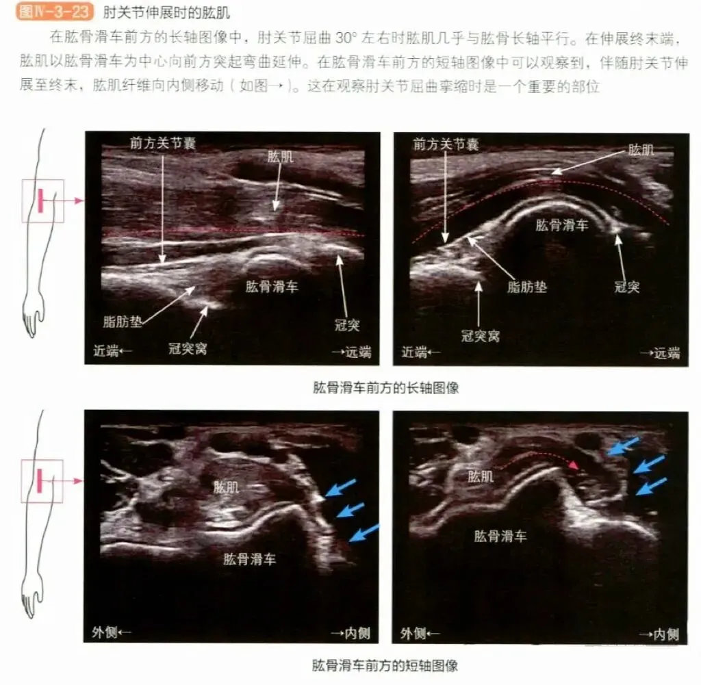 在以肘关节处于30°屈曲位开始的终末伸展中,肱肌在以肱骨为中心的矢状面上大幅屈曲,肌纤维在冠状面上的筋膜中向内移动。这种动力学特征是观察肘关节屈曲挛缩的重要知识。