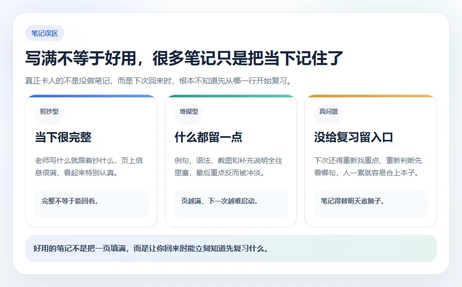 英语笔记最容易写成两种样子。一种是照抄型,老师写什么你记什么,生怕漏一句;另一种是堆砌型,今天摘例句,明天抄语法,后天又贴几张截图,最后一本子什么都有,就是没有“我下次先看哪里”。这种笔记做完当下很有安全感,可真正复习时成本特别高。你得先重新读一遍、重新找重点、重新判断哪句重要。人一累,就容易把本子合上。