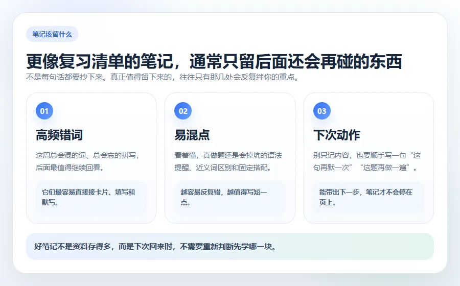什么意思?就是你记下来的东西,最好都是后面真会回来的。比如这周总混的两个词,一道总会看错的题型,一个你会认但一写就断的句子,或者一条老师讲完你当时懂了、隔天又糊掉的语法提醒。它们不一定多,但一定得和“下次还要碰”有关。