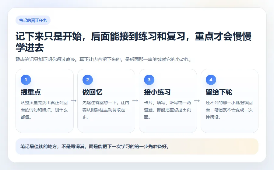 如果你手里已经有不少电子笔记、截图、PDF,也别想着先整理成完美档案。更现实的是先从里面挑一小批真要复习的内容出来,让它有下一步动作。比如今天只提 8 个高频词,或者 3 个总错的句子,后面马上接一次填写、听写或小题验证。这样笔记才不会一直停在“记过了”这一步。