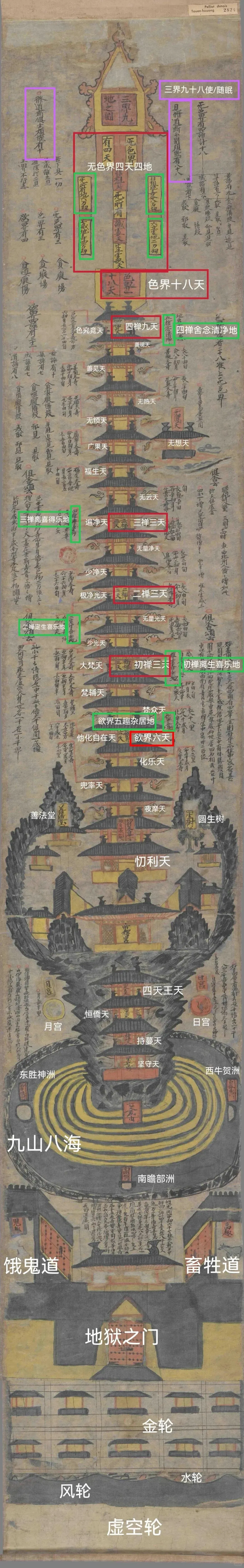 这是公元4-5世纪由印度高僧世亲菩萨所著《阿毗达摩俱舍论》,7世纪经由玄奘翻译,9-10世纪僧人依此译本向众生传播俱舍论所画的讲义稿,1908年被伯希和从敦煌藏经洞带到法国,法藏编号P.2824。这是目前发现的世界最早最完整的佛教三界九地图,它严格依据玄奘法师的译本绘制,将论的内容转化为直观通俗易懂的图像。