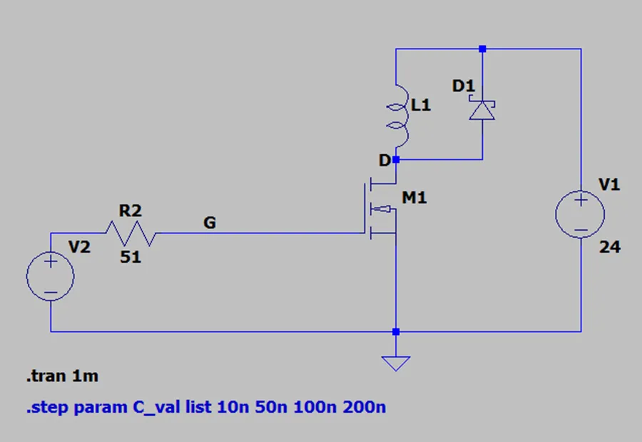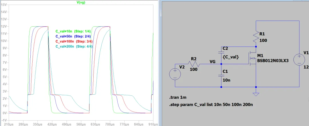 - 这是用LTSPICE 搭建的仿真,为了体现MOS 米勒电容的影响,在MOS 的外部并联了电容,并通过参数设置为10n ~ 200nF, 进行仿真,图上可以看到电容越大,米勒平台持续时间越久,平台越宽。
