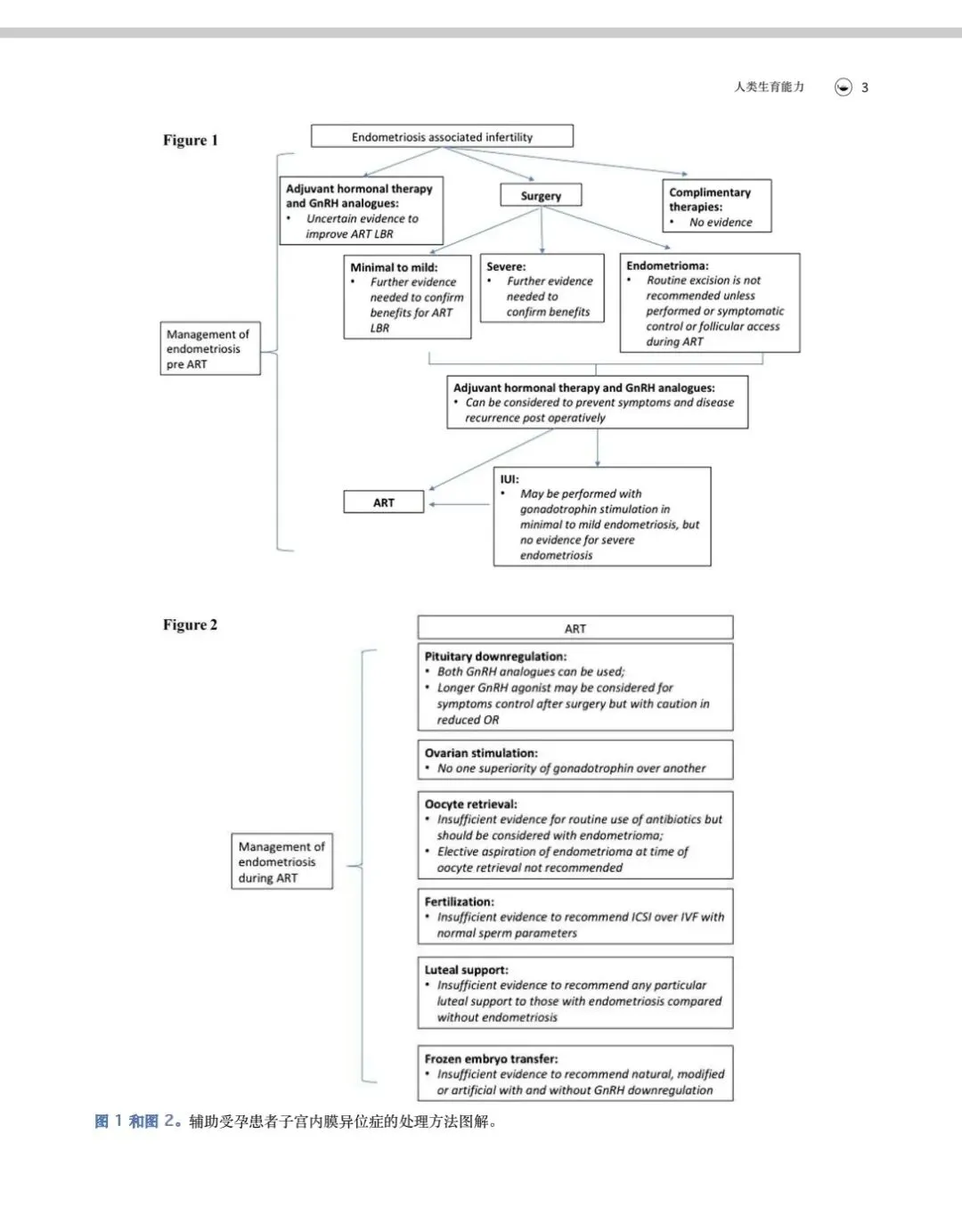 尽管针灸、瑜伽、电疗、运动等综合疗法和生活方式干预,已被证实对子宫内膜异位症相关疼痛有益,但无任何证据显示其能改善子宫内膜异位症相关不孕症的结局。氧化应激虽被证实参与子宫内膜异位症相关不孕症的病理过程,但抗氧化剂的治疗获益尚未被高质量研究证实;中药对该类不孕症的疗效也无循证证据支持,因此指南暂不推荐ART前常规使用上述辅助疗法和补充剂,其疗效仍需后续大样本研究探索。三、ART期间的子宫内膜异位症精细化管理:分层干预,兼顾疗效与安全