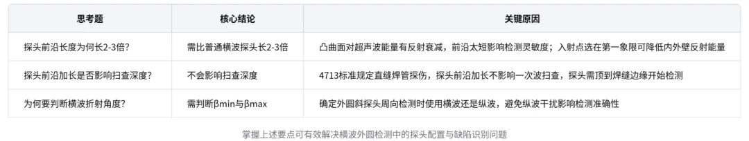 探头前沿长度问题:横波外缘双弧单孔法与横波外缘双孔法检测时,探头前沿要比普通横波探头长 2 - 3 倍。因为平面声源发射到凸曲面工件上,凸曲面对超声波能量有反射衰减,前沿太短会影响检测灵敏度,将入射点选在第一象限可降低内外壁反射超声波的能量。
