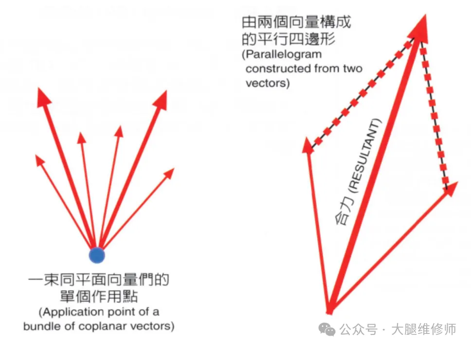 ② 力的向量交汇点:CC点是单关节与双关节纤维汇聚后,力的向量交汇之处。力的方向与大小在深筋膜上的特定位置汇聚,形成唯一的力平衡中心。它是肌纤维所产生的矢量的叠加点,据此定义了CC点。