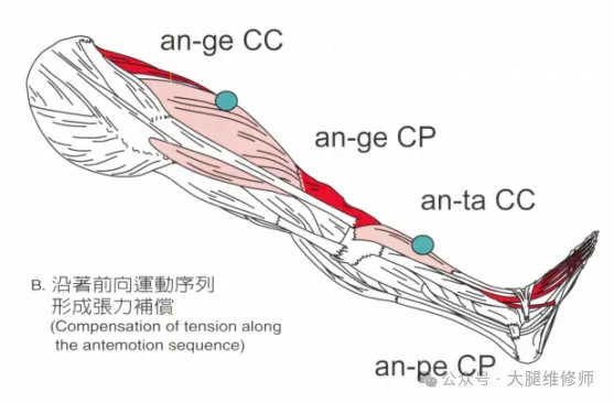但膝关节向后的运动并不是由后-膝(RE-GE)这一个肌筋膜单元孤立完成的,而是膝节段内六个肌筋膜单元相互协调与拮抗的共同结果。