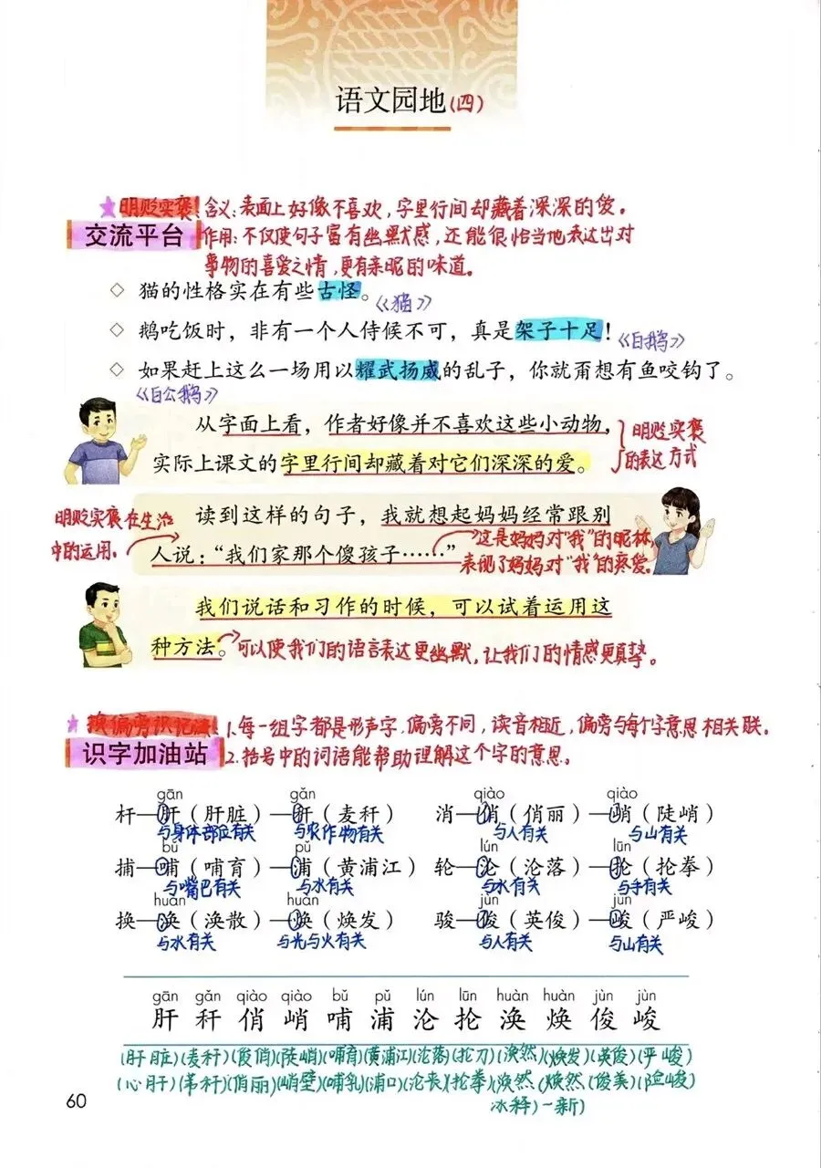 本板块核心是明贬实褒的表达手法,这是本单元课文《猫》《白鹅》《白公鹅》贯穿始终的写作特色。