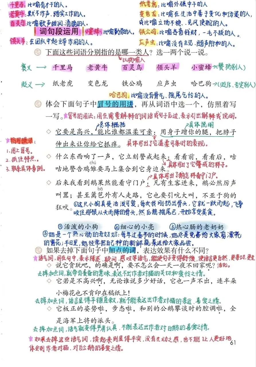本板块梳理了用动物比喻人的常用词语,按褒义(赞扬)、贬义(贬斥)分类,帮助学生精准理解与口语、写作运用: