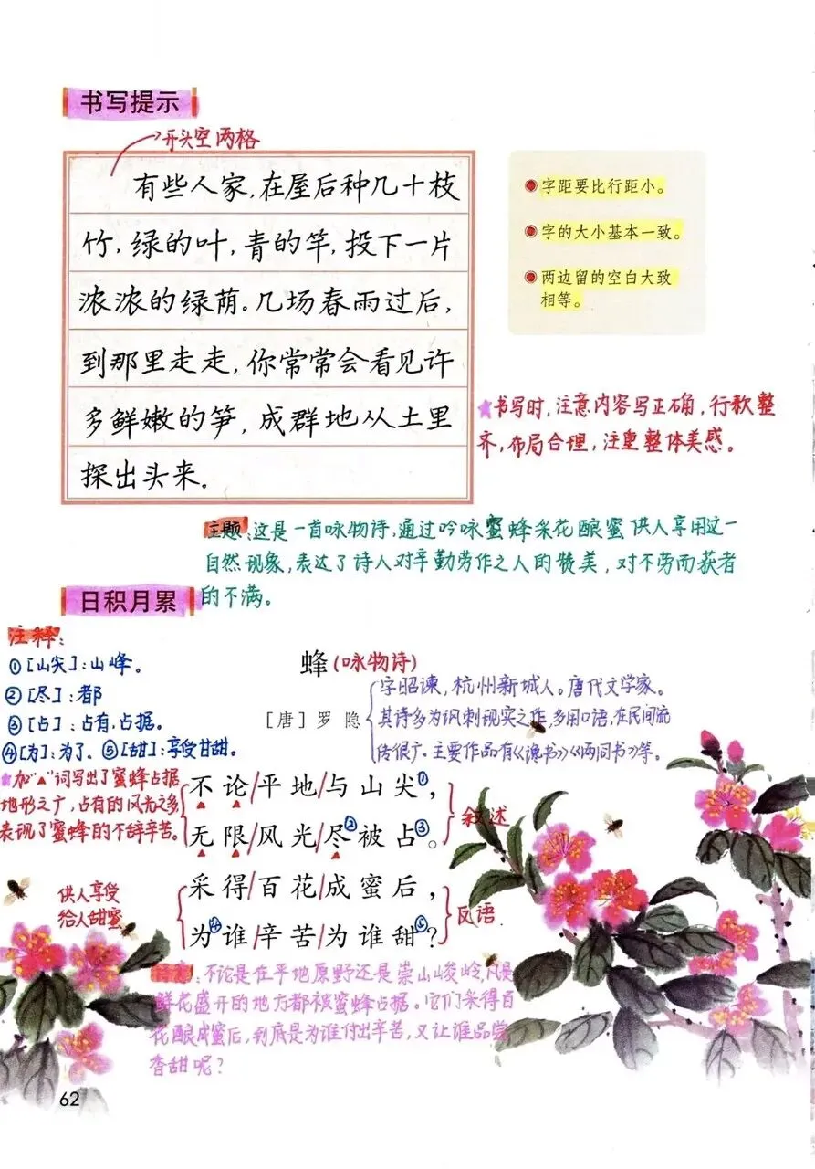 - 前两句“不论平地与山尖,无限风光尽被占”,用“不论”“尽”写出蜜蜂足迹遍布、不辞辛劳的特点,看似赞美蜜蜂的勤劳;
