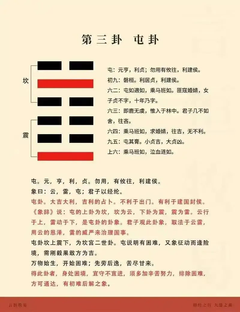 之前说屯卦的原始意象,就是“屯”字本身,根系渐深,嫩芽初生。寓意着万事万物初生时不免艰难曲折,但前途必然灿烂光明,不可限量!