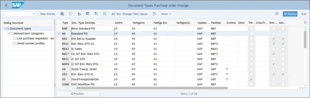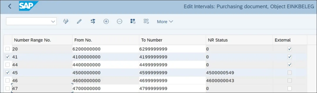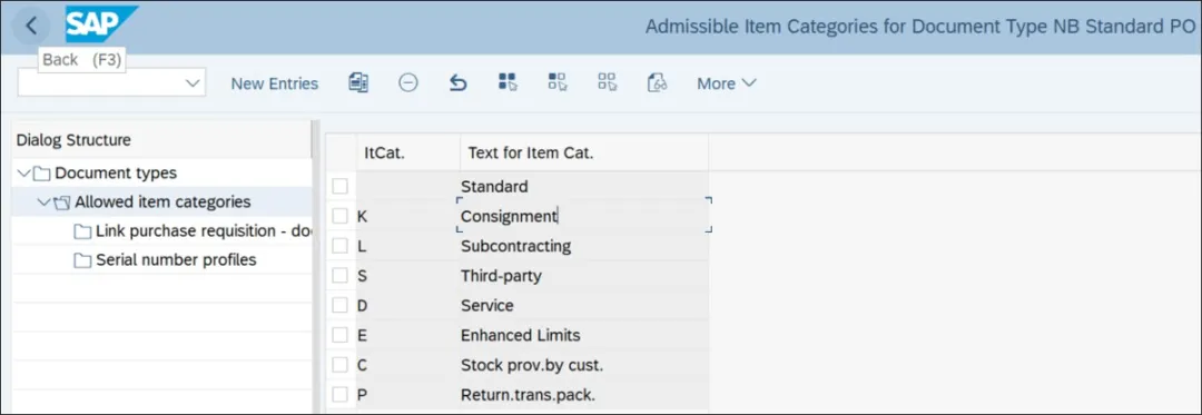 要创建采购订单、报价请求和框架协议文档类型,请执行事务代码 SPRO,然后导航至“物料管理 • 采购 • 采购订单 • 定义采购订单的文档类型”。下图展示了配置采购申请文档类型的第一步。类型:这是采购订单、报价请求或框架协议的文档类型。ItmInt(项目间隔):这控制采购文档行项目编号的间隔。例如,如果此值设置为 10,则采购订单中的行项目编号将以 10 为间隔创建(10、20、30 等)。NoRgeInt(内部编号范围):这控制采购文档(报价请求、采购订单和框架协议)的内部文档编号。要进入编号范围配置步骤,请执行事务代码 SPRO,然后导航至“物料管理 • 采购 • 采购订单 • 定义采购文档的编号范围”。您也可以通过执行事务代码 SNRO 直接进入此配置步骤。在此配置步骤中,可以针对编号范围对象 EINKBELEG 定义内部和外部编号范围。下图展示了内部和外部编号范围的配置。NoRge Ext(外部编号范围):这控制采购文档的外部文档编号。如下图所示,外部编号范围将设置“外部”指示符。Update…(更新组):这是一个逻辑元素,用于控制采购文档信息如何在物流信息系统中更新。物流信息系统收集并存储来自销售、采购、工厂维护等方面的数据。SAP 更新组将信息存储在物流信息系统的采购区域中。FieldSel.(字段选择键):字段选择键代表采购文档的布局,包括必填字段、可选字段和显示字段。NBB 是采购申请文档的标准屏幕布局。Trfr…(库存转移:考虑供应商数据):此指示符控制是否可以在考虑或不考虑供应商数据的情况下创建库存转移订单。如果设置此指示符,则必须创建作为供应商的供应工厂,并且系统将从供应商主记录中读取供应商信息。Enh…(增强型门店退货):此指示符控制在门店退货(库存转移订单)过程中是否只能创建外向交货,还是在门店退货过程中需要同时创建内向和外向交货。如果设置此指示符,则在门店退货过程中必须同时创建内向和外向交货。Adv…(高级退货管理):此指示符控制采购文档是否启用高级退货管理。采购文档类型配置的下一步是将允许的项目类别分配给文档类型。要进入此步骤,请从文档类型列表中选择一个文档类型,然后在对话框结构中双击“允许的项目类别”。下图展示了采购文档类型 NB(标准采购订单)允许的项目类别。你若喜欢,点个❤️谢先👇