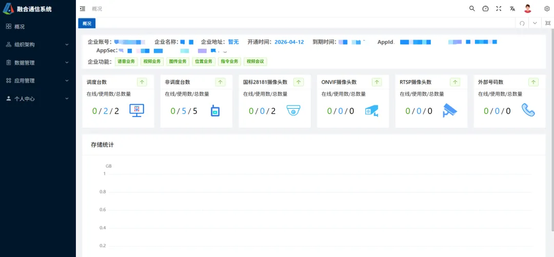 登录成功后我就来到了通信系统的首页,首页信息包括企业账号,企业名称,企业地址,开通时间,到期时间,ID和身份验证相关信息。
