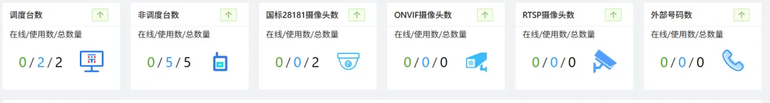 目前由于我未添加设备,关于调度台数,非调度台数,摄像头数这些在线数都为0。