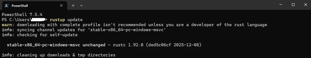 打开 Terminal/Powershell 输入 rustup update 更新 Rust