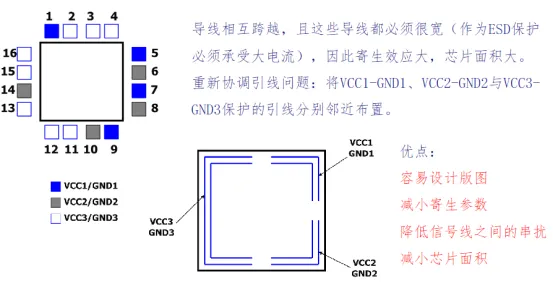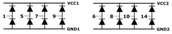 引线1、5、7、9通过VCC1和GND1得到保护,引线6、8、10、14通过VCC2和GND2得到保护。