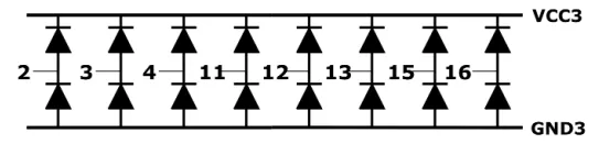 引线2、3、4、11、12、13、15、16通过VCC3和GND3得到保护。