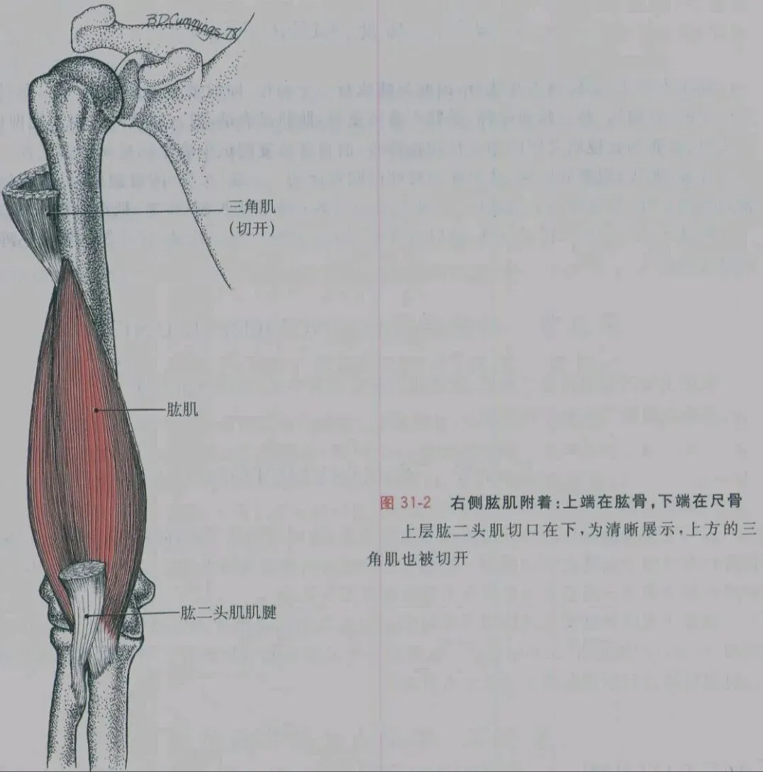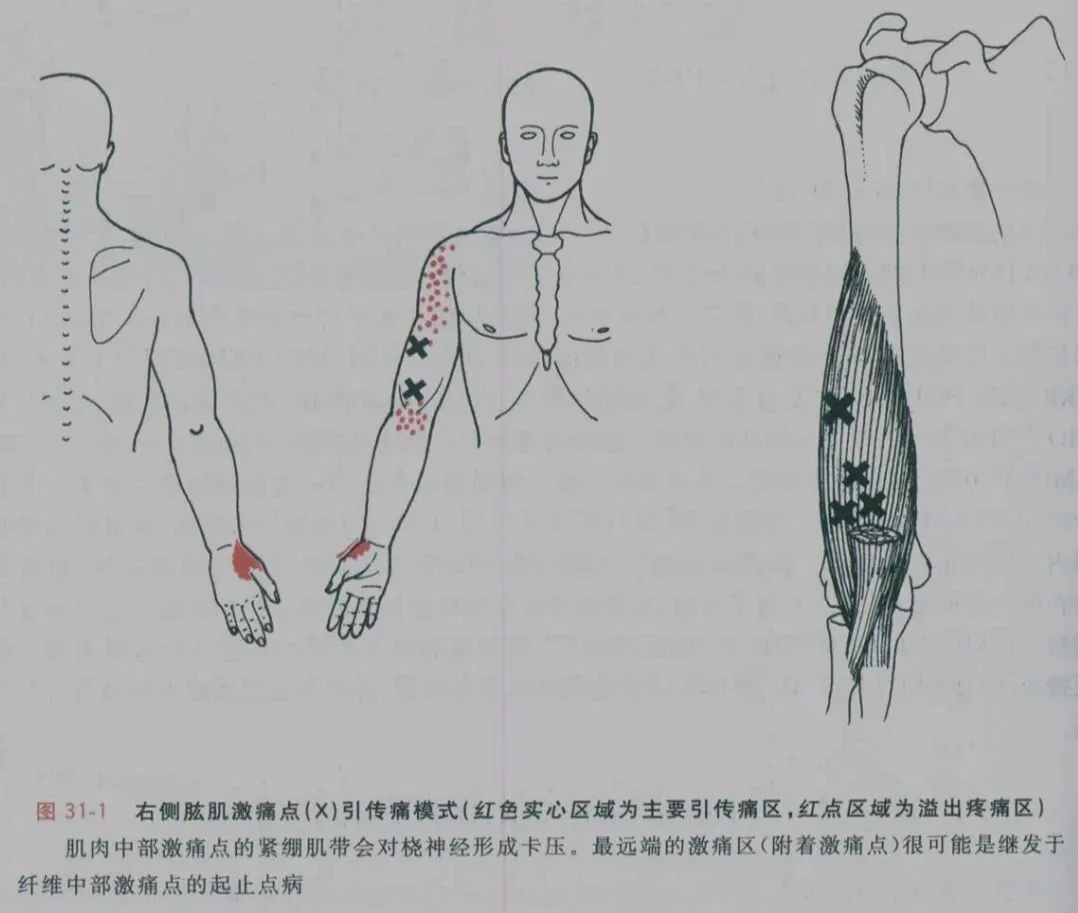 Kelly 也发现了同样的引传痛模式。图 31-1 中最远端的附着激痛点位于肘窝上方几厘米处,很可能是继发于肌肉中部激痛点的起止点病,其溢出式疼痛可覆盖肘窝。偶尔向上延伸到三角肌上的疼痛更可能源于肱肌内最近端的激痛点。