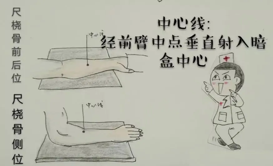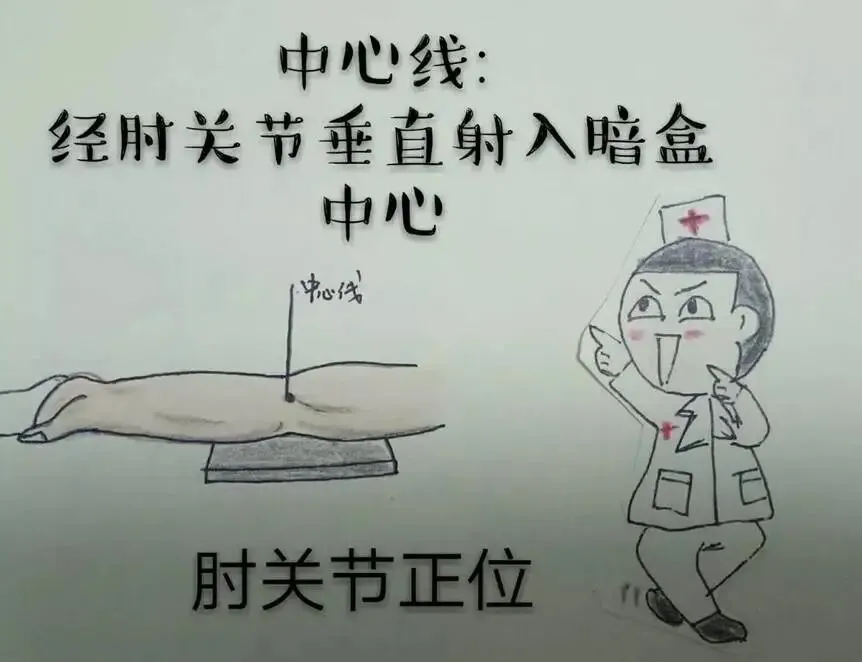 (4)中心线对准肘关节(肘横纹中点)垂直射入探测器中心。