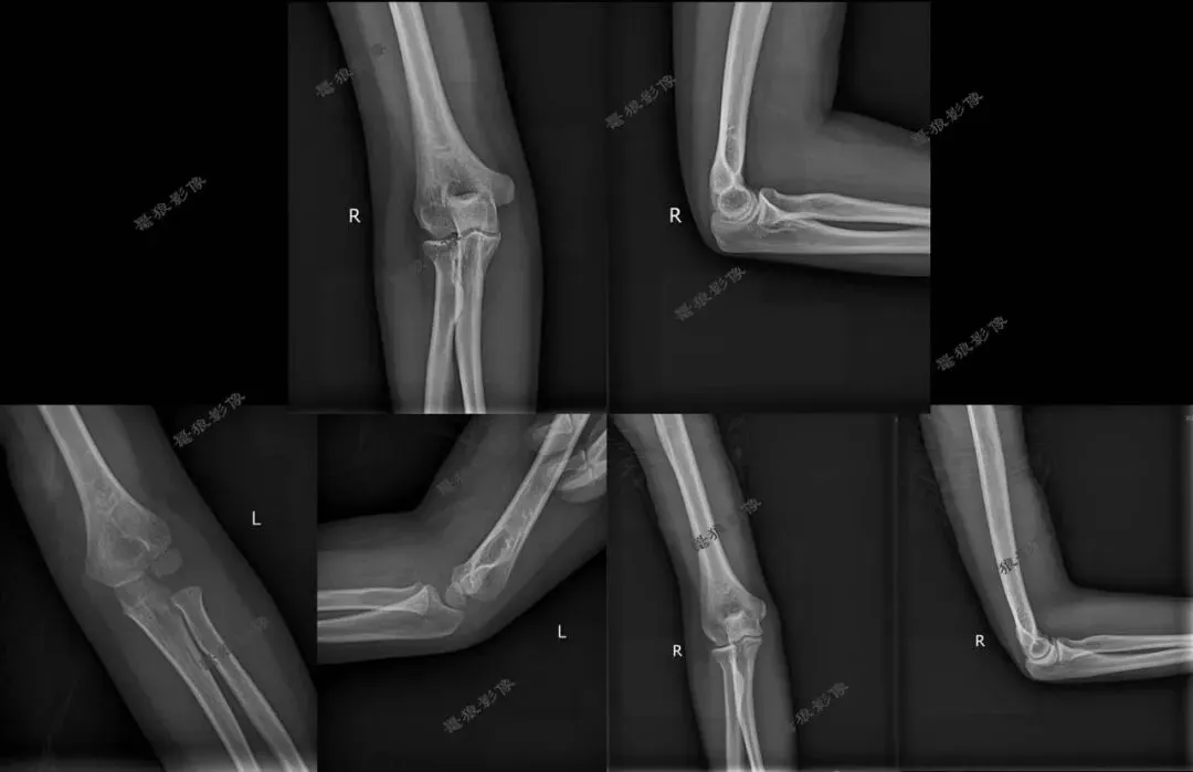 (4)肘关节诸骨纹理清晰,周围软组织层 次分明。