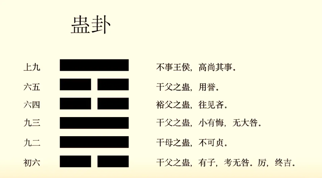 彖曰,蛊,刚上而柔下,巽而止蛊。蛊,坏极而有事也。蛊,坏之极,乱当复治,故其占为元亨而利涉大川。甲,日之始而事之端也。前事过中而将怀则可自新以为后事之端而不使至于大坏。后事方始而尚新,然更当致其丁宁之意以监其前事之失而不使至于速坏。事情开始之前要推断事之由来,事情发生后再考虑事之所备。