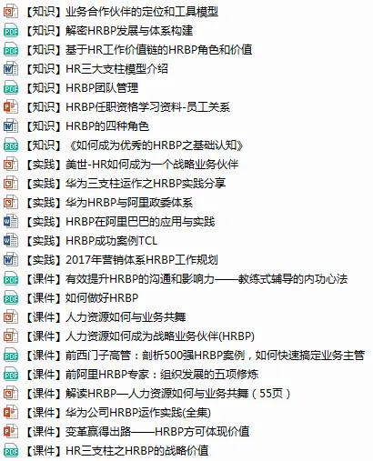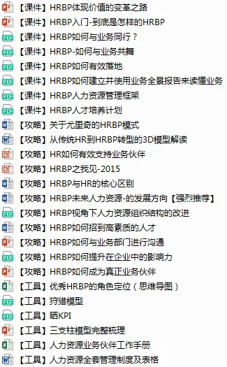 HRBP工作学习集包括HRBP基础知识、工作手册、实践案例、培训课件、干货、工具模板。