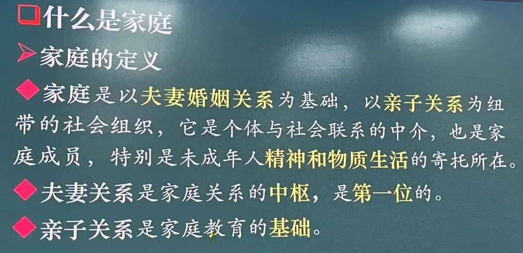 什么是家庭?家庭是以夫妻婚姻关系为基础,以亲子关系为纽带的社会组织,它是个体与社会联系的中介,也是家庭成员,特别是未成年人精神和物质生活寄托所在。夫妻关系是家庭关系的中枢,是第一位的。亲子关系是家庭教育的基础。