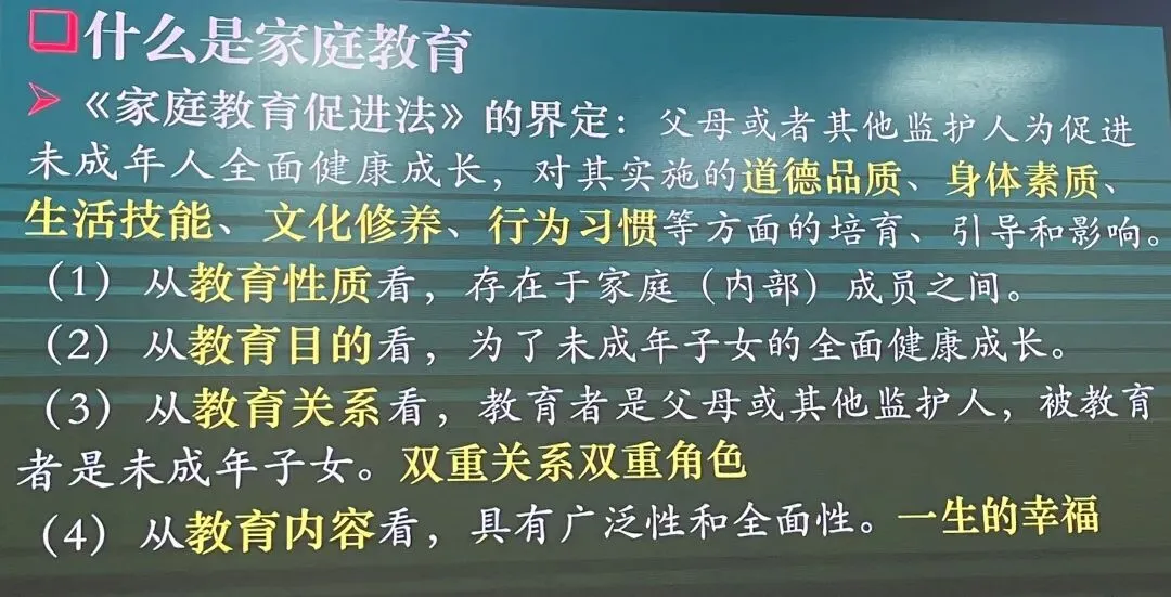 什么是家庭教育?父母或其他监护人为促进未成年人全面健康成长,对其实施的道德品质、身体素质、生活技能、文化修养、行为习惯等方面的培育、引导和影响。