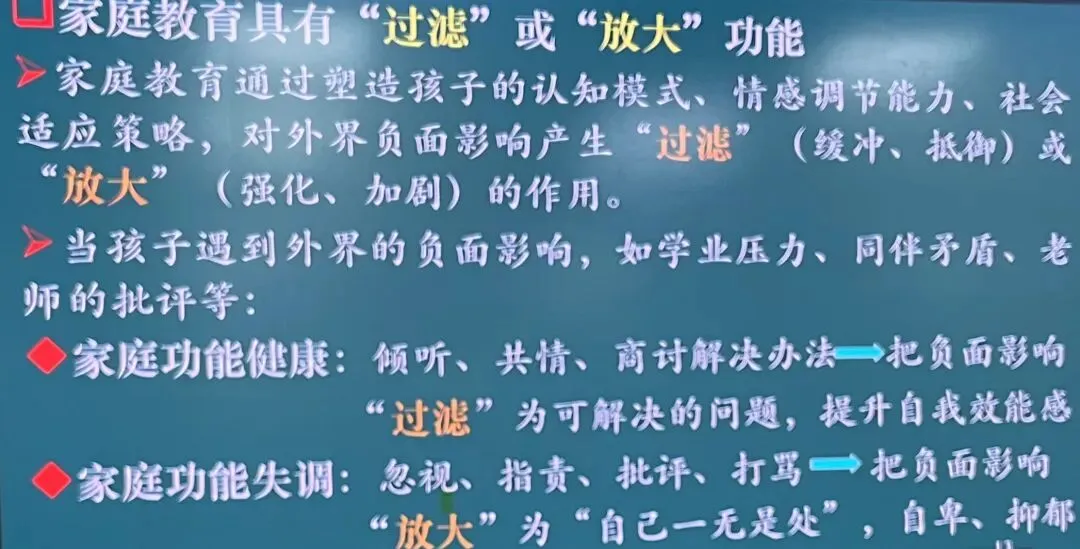 家庭教育具有“过滤”或“放大”功能。家庭教育通过塑造孩子认知模式、情感调解能力、社会适应策略、对外界负面影响产生“过滤(缓冲、抵御)或“放大”(强化、加剧)作用。