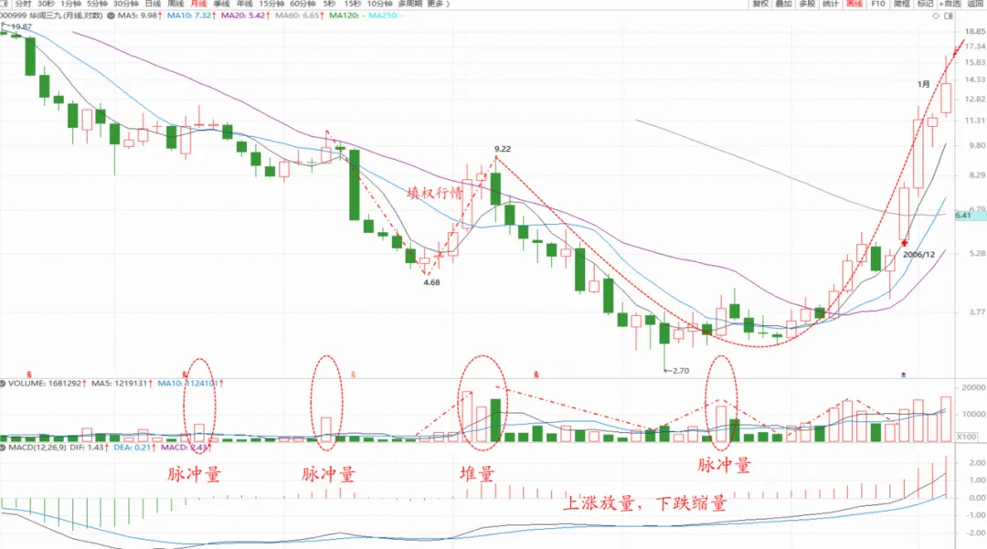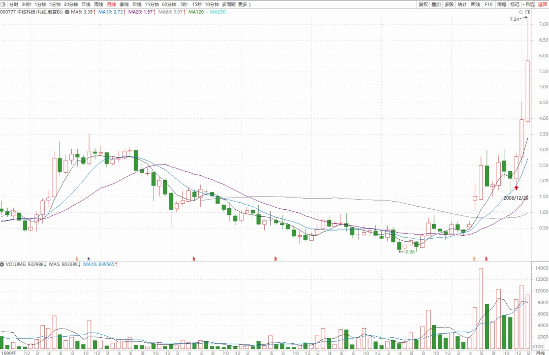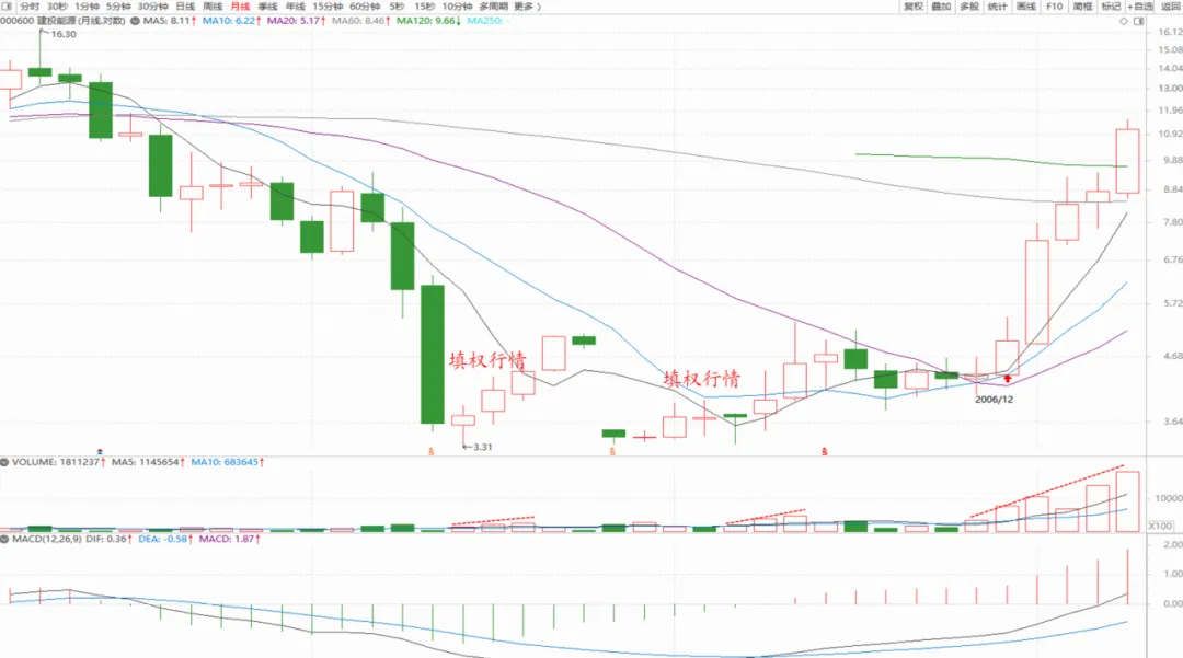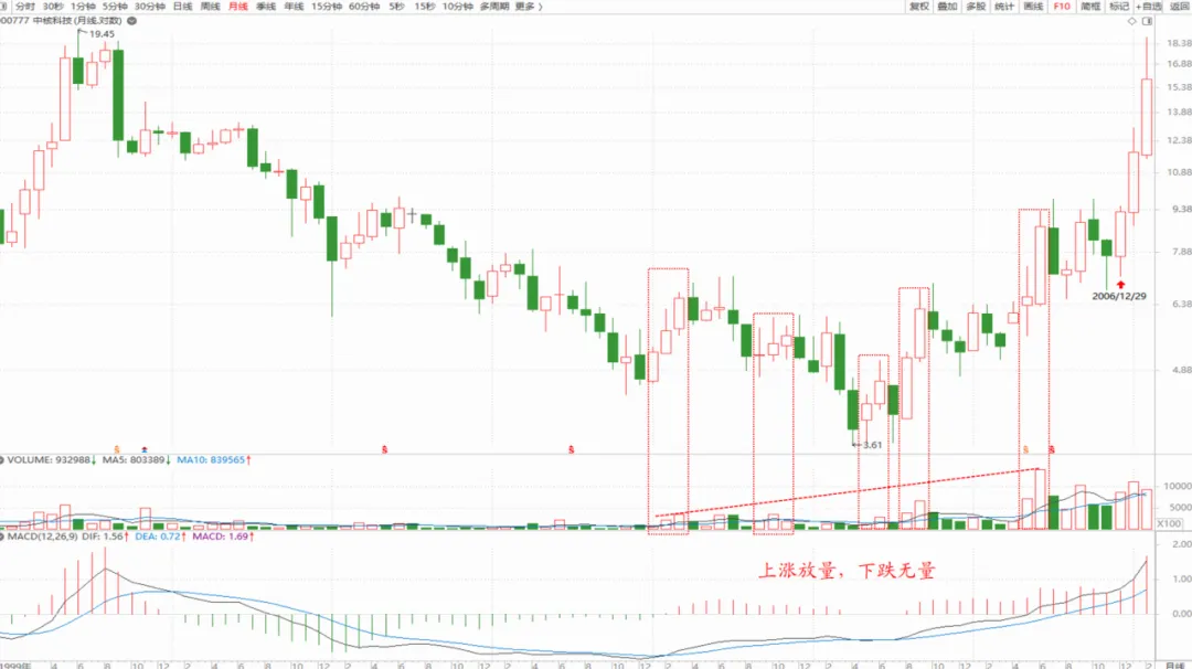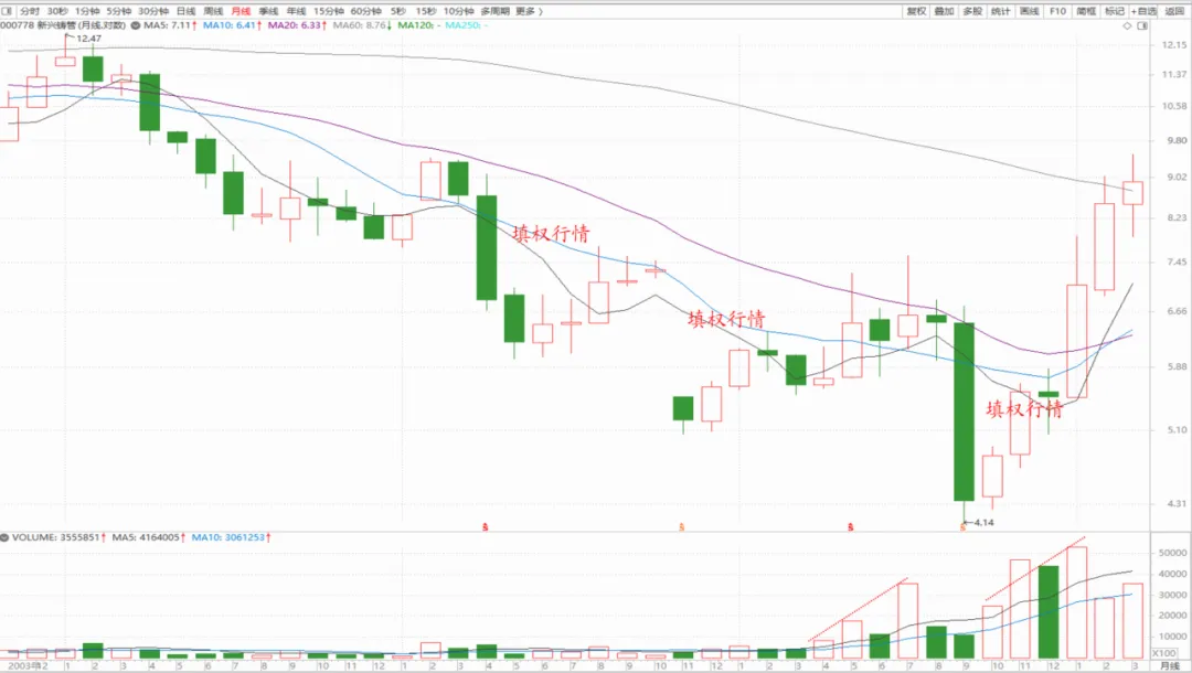 看看它复权之后的月线图,成交量就能给出答案。
