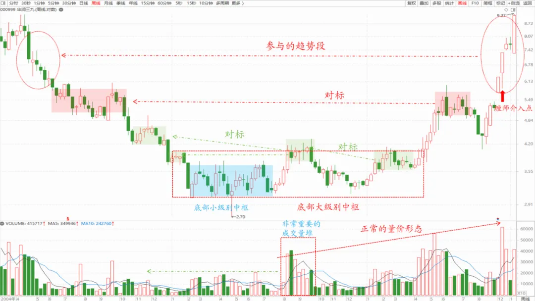 4、本节课最后一段,缠师讲了零向量的技巧,尤其是大资金,从技术面讲,就是至少是周线级别的第三类买点介入。缠师具体分析了原因,可以看原文。这里我仅仅谈谈个人的理解。缠师在这段话中提了个庄家成本的概念,也就是说底部中枢的位置,就是庄家成本的位置,尤其是中枢的中轨。拉升空间可参考前期的中枢位置。