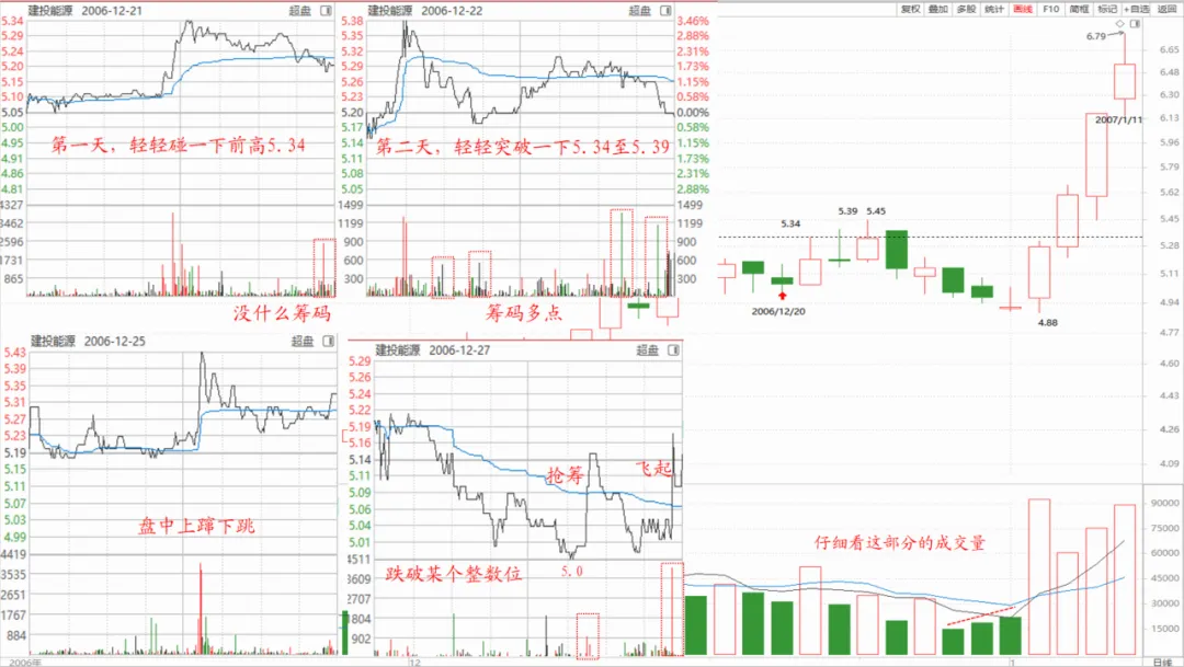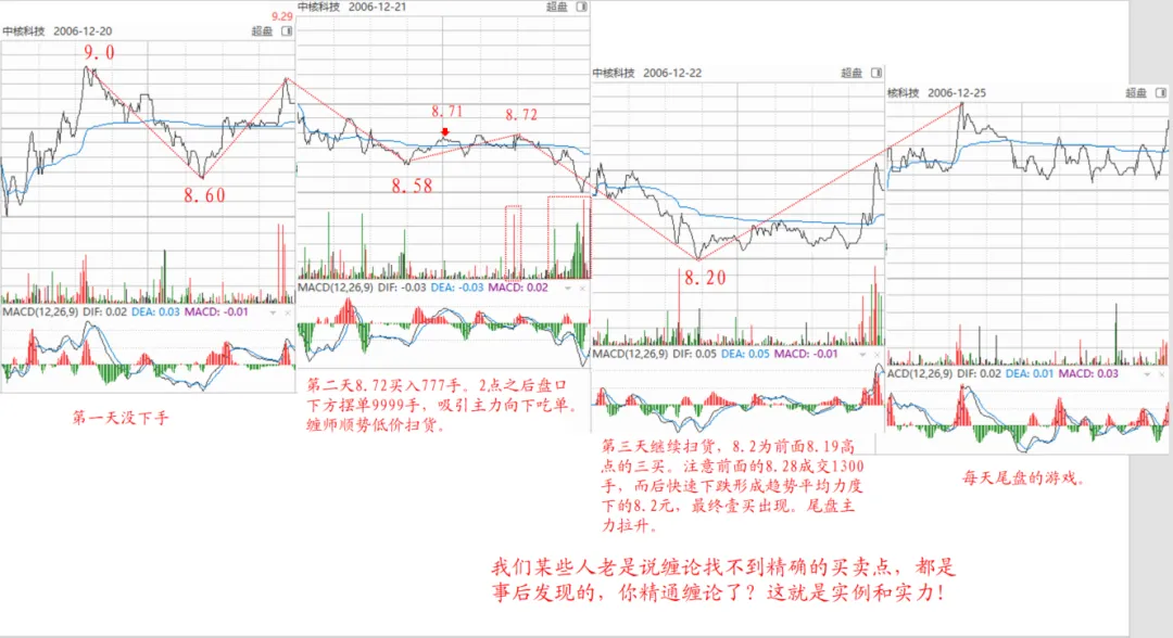 2、本课第二段有几个数据,这里分析下:8亿大米留下1亿机动,也就是说首先不是满仓,要留12%的流动资金,这部分资金做日T或者波T,而且也不是全部使用,会根据盘面情况来定,也就是技术面。还有个数据就是12月20日至1月11日发文,也就是二十天的时间,恰好一个月的交易周期,平均算差不多每天700万,按照当时的市场环境,这个金额算是大的了。缠师还有一句话:“撑活他”,一块肥肉,大家都想抢,来者不拒,关键是看个人的本事。从这里我们就大致得出一个结论,先不管其他的,涨停板或大阳线是界定是否有主力参与的一个重要条件。