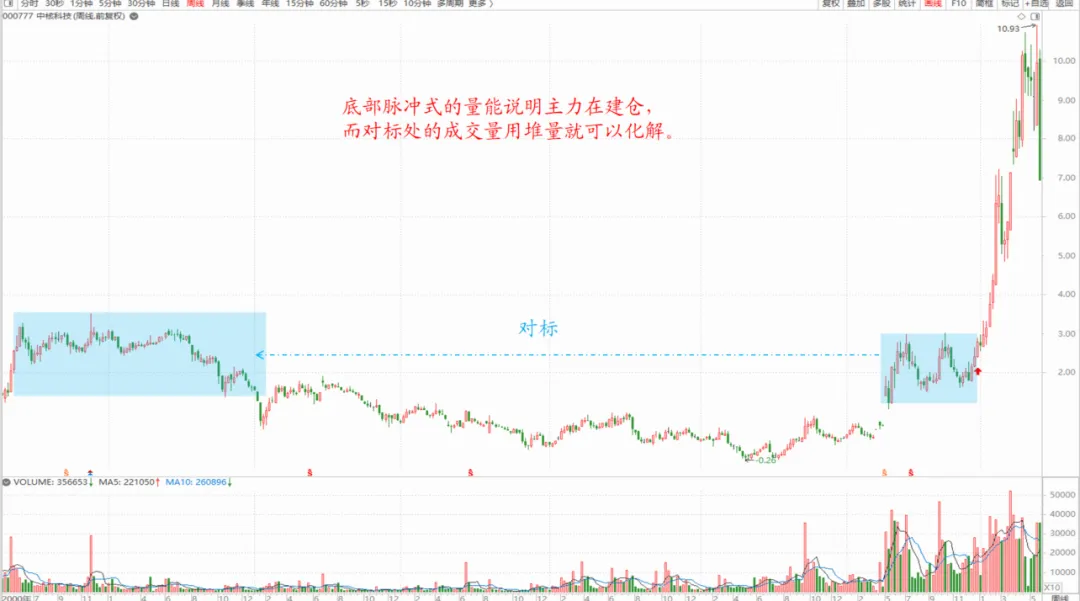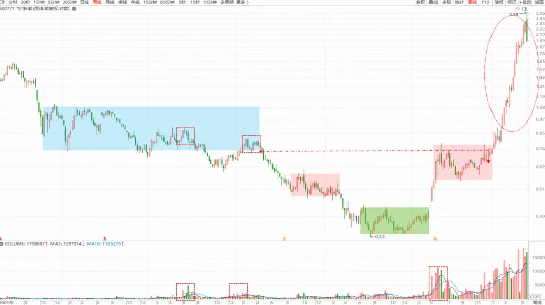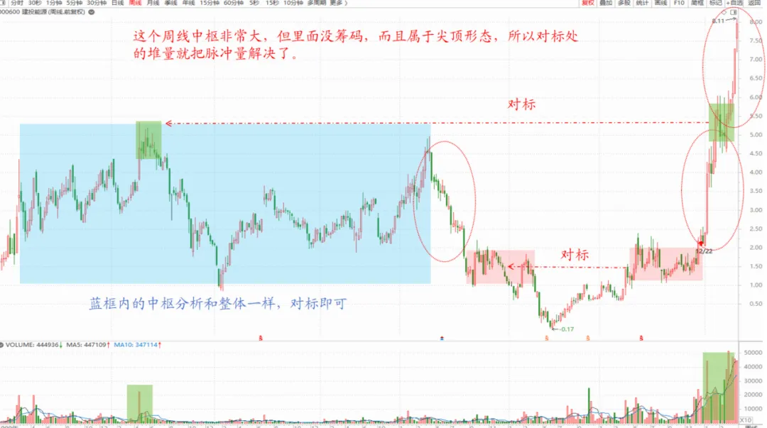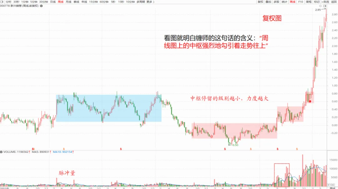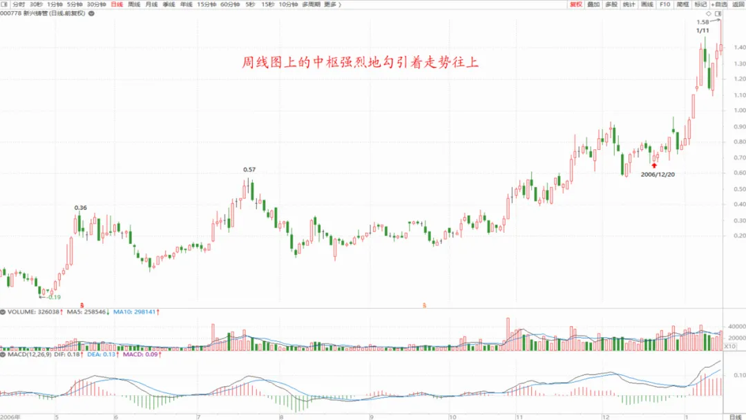 我们看周线图上中枢形成机理:这个中枢比较特殊,放量越过前面下跌的中枢,也介于上面那个中枢之间,上面这个大中枢没量,所以后期幅度比较大。用的是复权图。