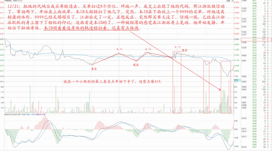 这股缠师与庄家在抢筹,从12月21日至1月11日,总成交额只有5.32亿。需要注意的一点是,买卖点是等出来的,怎么等,前一个高(底)点的位置是一个参考点,在即将快到这个点位时,就是一次机会,但是这个机会一定要出手吗?不一定,我们还是要再等,等另外一个信号,看是否有资金进去,图中8.2前面那一笔8.28成交了1300手,这是第二个信号,我们等出来了,如果你想在这个点位进去,那么盘口应该可以给你提示,如果还想等,那么就等第二类或第三类买点,尾盘冲上分时均价线后有个回踩,这就是一个很好的三买,看分时,很标准的一个盘整,而后直接拉升。