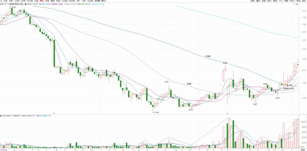 从12月20日到1月11日成交额7.15亿,而且里面庄家比较多,缠师大米藏得快。这个股的特点是前面的两根大阳线。而后下跌不破大阳线的底部,而且底部是逐步抬高的,12月20日很好的一个日线三买。