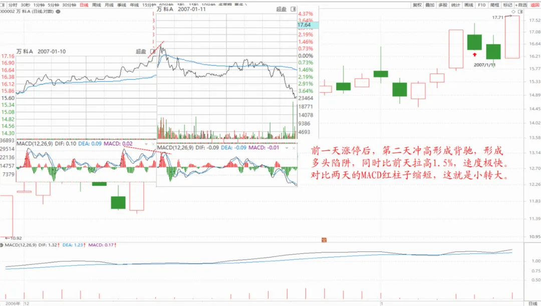 15、缠师语:“日线上出现的上涨,并不一定都是因为日线上的买点造成的,其他级别的也可以”。(尤其是小转大,本节课后答疑万科A的实例就是(反方向))